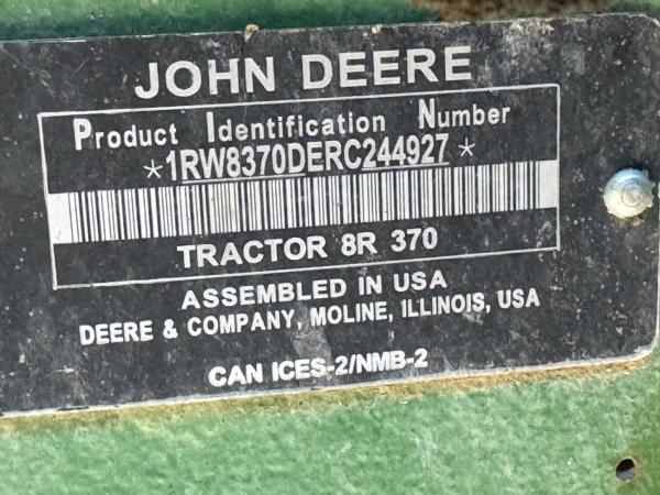 2024 John Deere 8R 370, 8R370, Command Pro IVT, 6 rear SCV, 480/80R50 Firestone rear tires, 420/85R34 front tires, front fenders, Aux hydraulic couplers, 1 pair 450 lbs. rear wheel weights, 16 front weights, Hydraulic power steering, rear fender controls, Signature edition. G5 plus display, integrated SF1 receiver. Before driving to see this item, please call or email to confirm availability