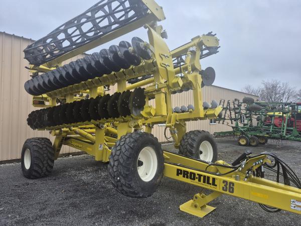 NEW PRO TILL 36' HIGH SPEED DISK - 9 BAR CAGE ROLLER - 20" NOTCHED FRONT AND SMOOTH REAR BLADES, Before driving to see this item, please call or email to confirm availability.