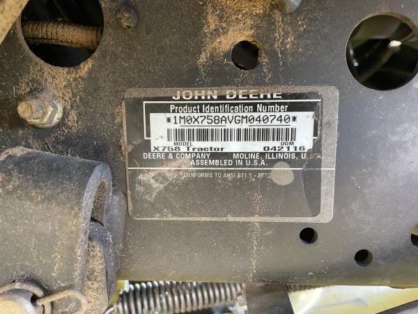 2016 JOHN DEERE X758 GARDEN TRACTOR, 4WD, 25.5HP LIQUID COOLED EFI KAWASAKI ENGINE, P/S,. REAR DIFF LOCK, 60" HGH CAPACITY DRIVE OVER AUTO CONNECT DECK, HYD DECK LIFT, 3PT HITCH, HDAP TIRES. Before driving to see this item, please call or email to confirm availability.