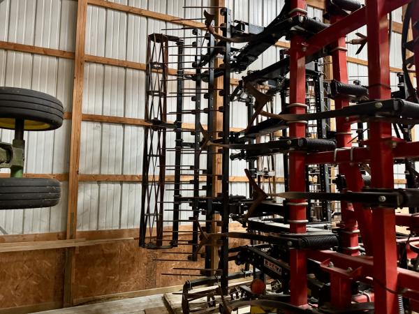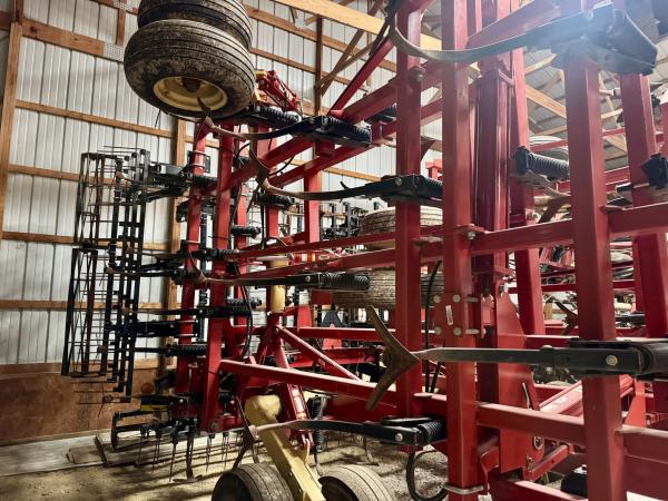 2010 Krause TL6200 45' Soil Finisher, 5 Sections, Double Fold, 3 Bar Coil Tine Harrow with Flat Bar Rolling Basket, Front disks, Walking Tandems, Field Ready.