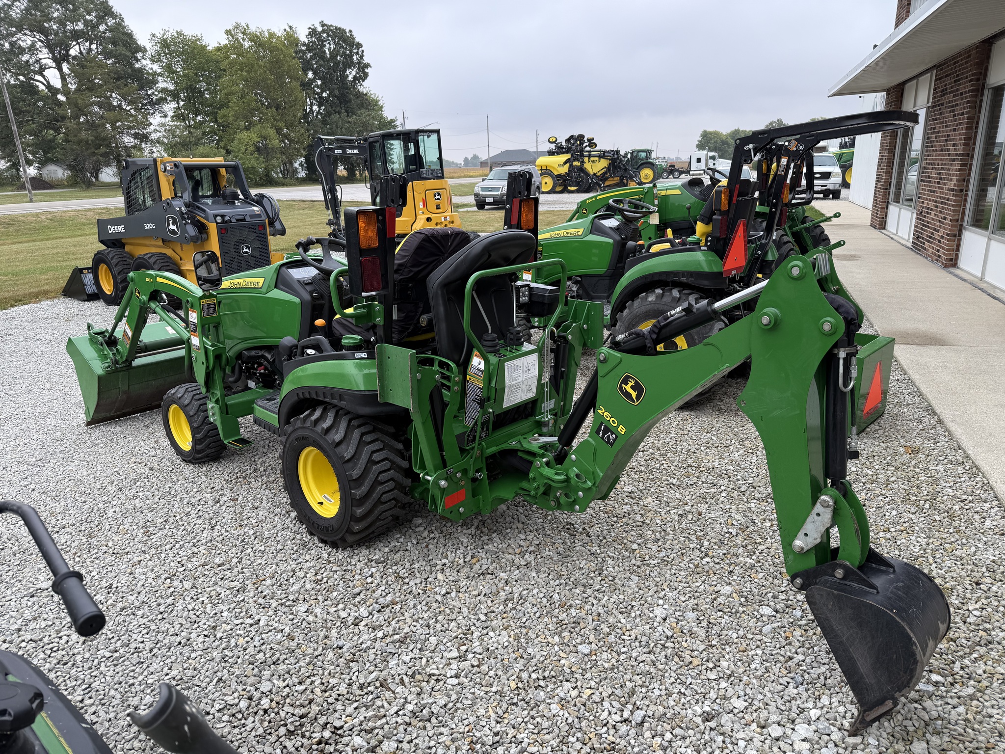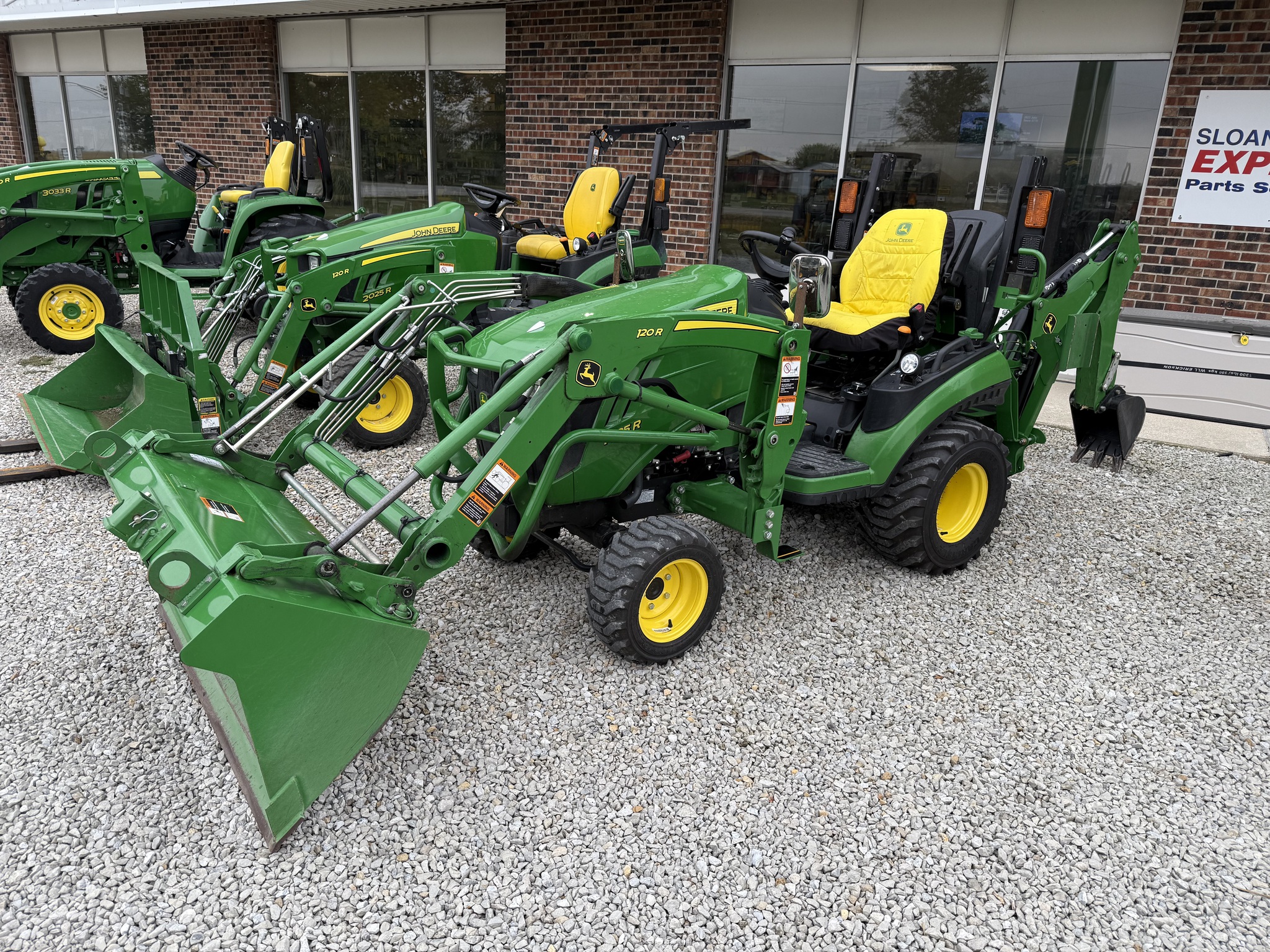 2018 John Deere 1025R, 120R Loader, 260B Backhoe, Hydrostat Transmission, 25 Horsepower, Yanmar Diesel Engine, Deluxe Seat w/ Armrests, Work Lights, Rear Facing Work Light, Boarding Step, Rear View Mirrors, Multi-Point Dual Mid-SCV Couplers, R-4 Tires, Folding ROPS.