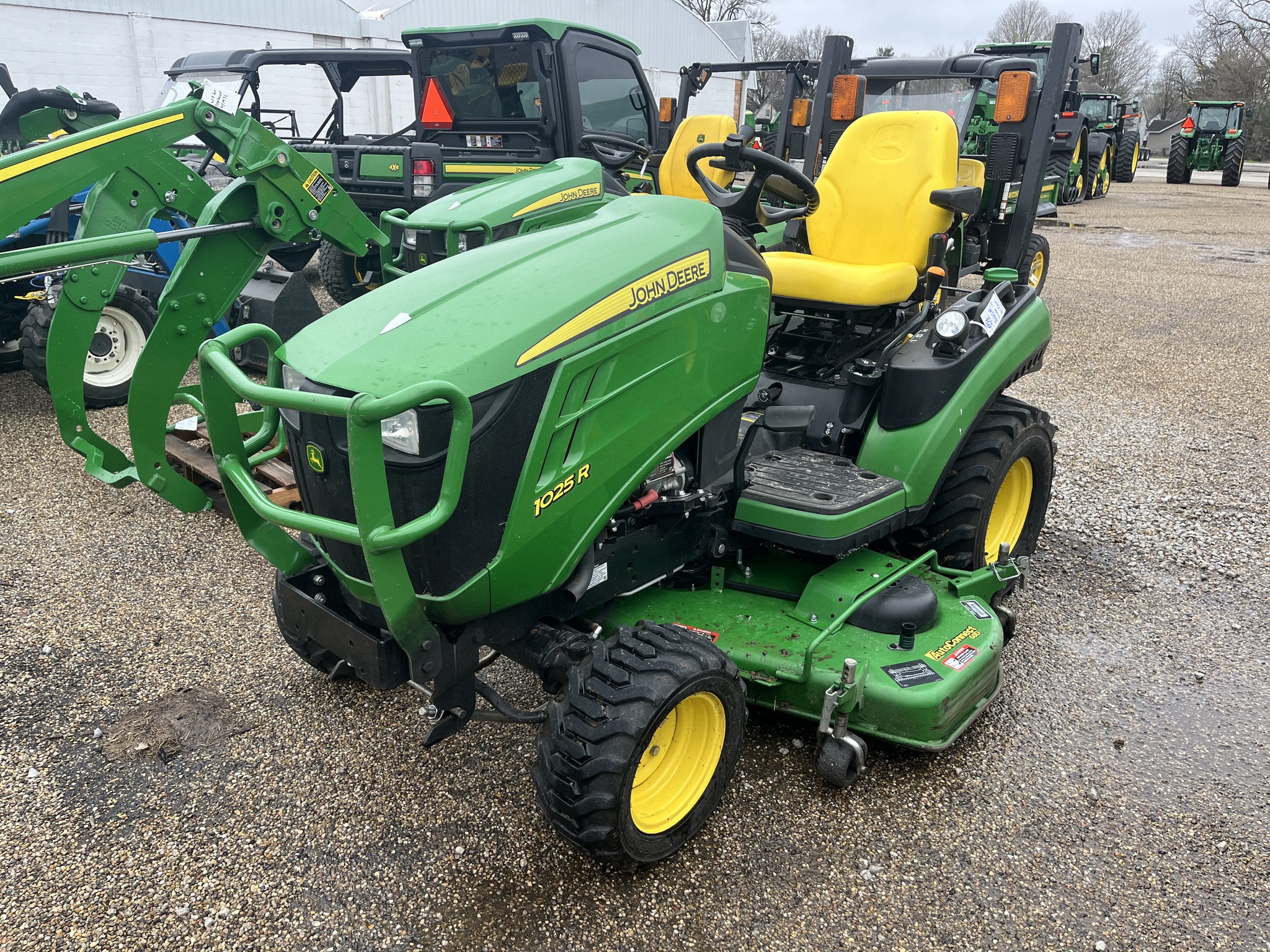 2019 JOHN DEERE 1025R COMPACT UTILITY TRACTOR, R4 INDUSTRIAL TIRES, 25 HP YANMAR 3 CYLINDER LIQUID COOLED DIESEL ENGINE, MID PTO, REAR 540 PTO, THREE POINT HITCH, JOHN DEERE 60" SIDE DISCHARGE MOWER DECK WITH AUTO CONNECT RAMPS AND CONNECTION, POWER STEERING, FOLDING ROLL BAR PROTECTION, DELUXE SEAT, LESS LOADER, ONE OWNER. USED PRIMARILY FOR MOWING, Before driving to see this item, please call or email to confirm availability.