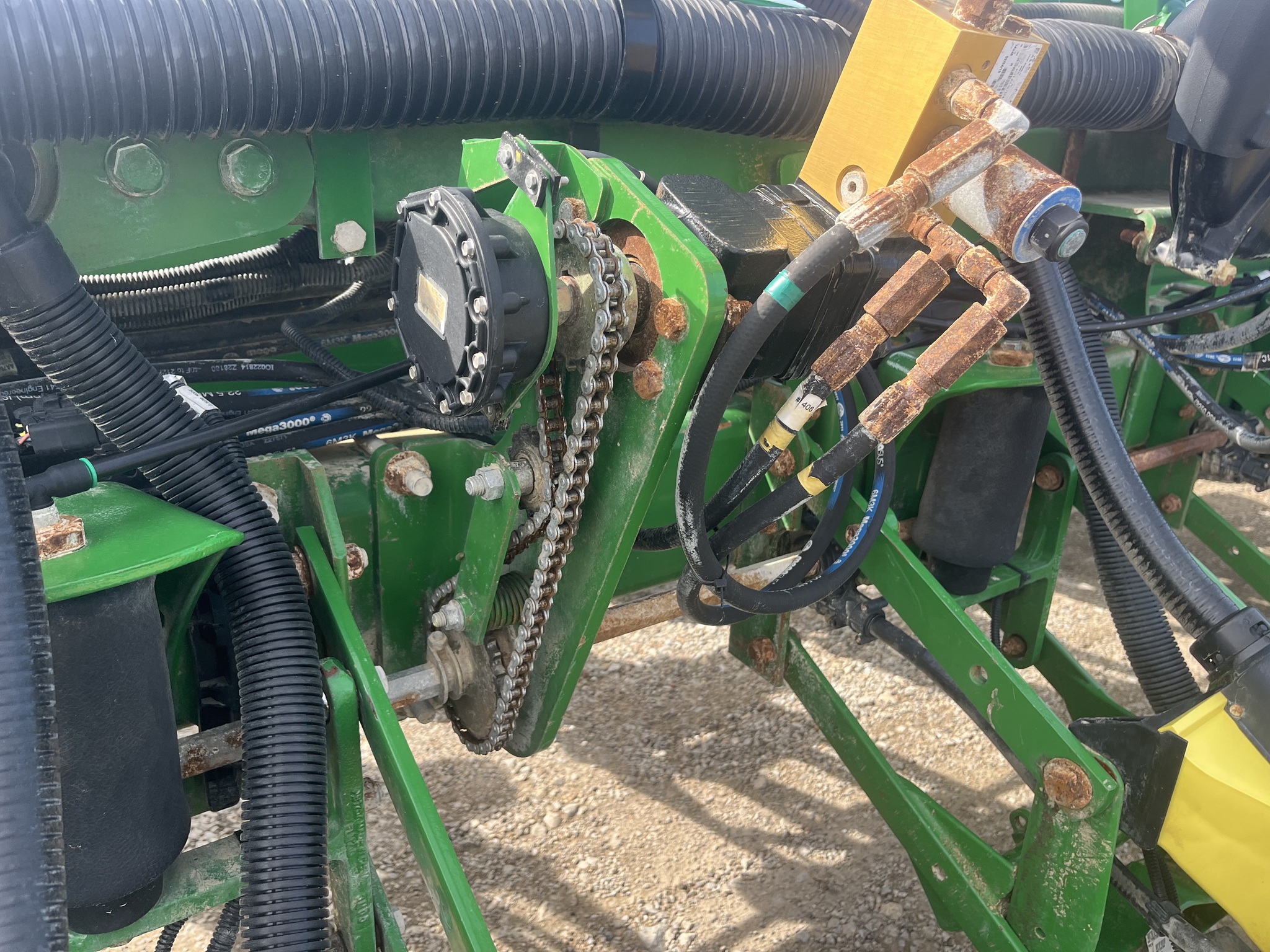 - Piston Pump, Twelve Port Block Manifold Delivery System with Hoses and Frame Mounted Single Disk Fertilizer Openers