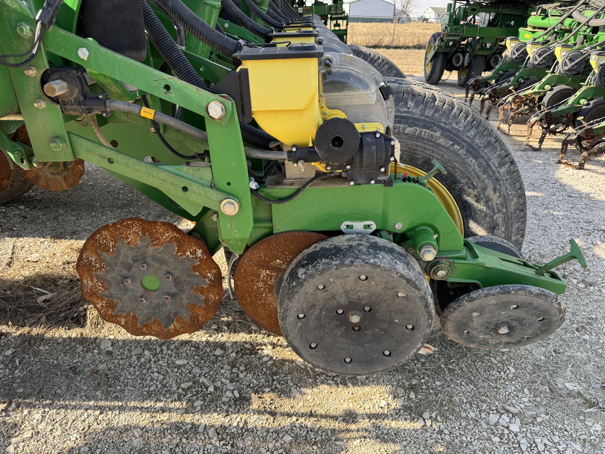 John Deere 24 row 30" planter. Row clutches. CCS. In furrow liquid fertilizer w/ ground driven pump. Flex Fold, Vacuum, Central Fill System, Has Row Command. 23336 acres, No-Till coulters, Corn plates, rubber tire closing wheel, 450 gallon liquid tank. Before driving to see this item, please call or email to confirm availability.